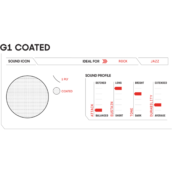 G1 Coated drumheads seamlessly blend bright tone, lengthy sustain, and solid durability to create a high level of playing versatility. Featuring a single ply of 10mil film, the G1 tom head produces an open and expressive sound with a wide tuning range, while the coating delivers additional warmth, focus, and depth. G1 heads have a very balanced attack, long sustain, bright tone, and average durability. This coated drumhead also features Level 360 Technology.