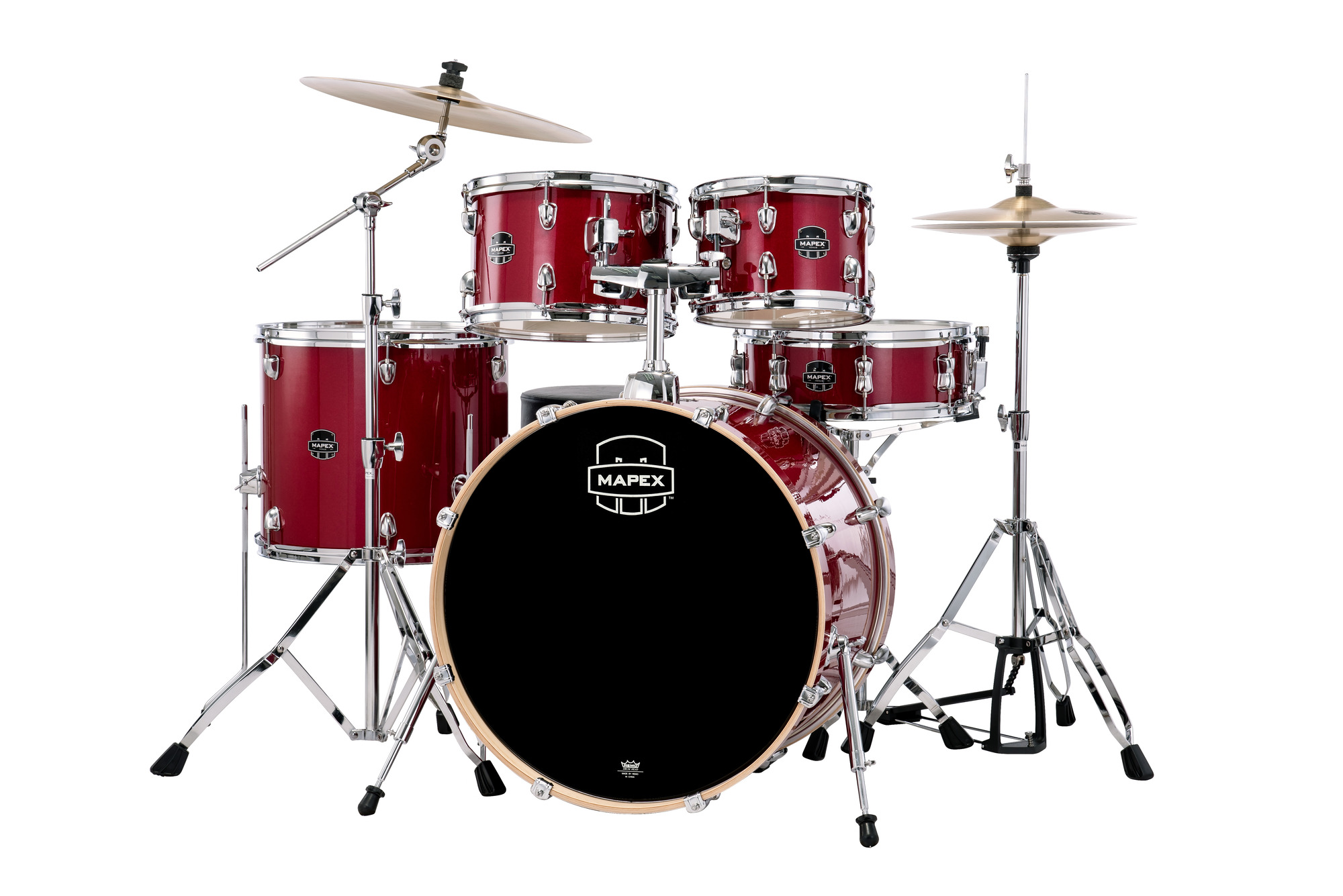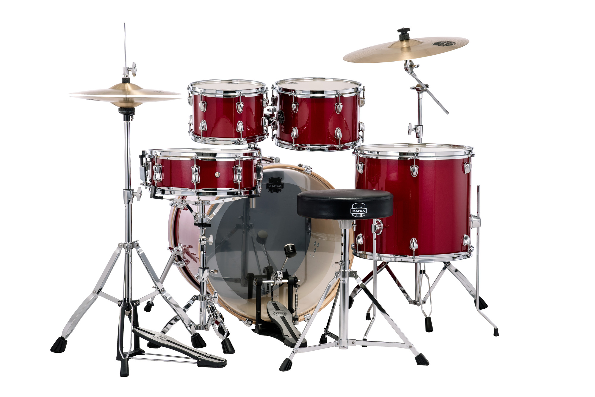 Mapex Venus is the complete drum kit delivering great sound and dynamic looks with everything needed to begin your "Drummer for Life" journey. Poplar shells with Mapex SONIClear™ bearing edges for quick and effortless tuning, and shorter tom size depths deliver instant full tone and allow for easier set up and tom positioning.