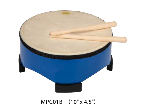 MANO PERCUSSION - 10" floor drum. 4.5" high. Painted wooden shell with 4 large rubber feet. Natural hide pre-tuned head. Pair of wooden beaters included. Blue finish.