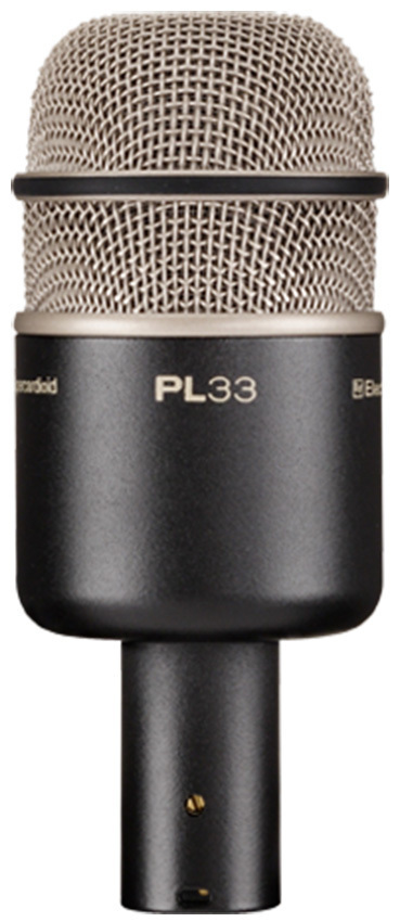 With its tight low end, kick drum-modified mid-range and high frequency response, the PL33 delivers all of the percussive impact detail professional drummers and sound system engineers require. The PL33s tight supercardioid polar pattern is designed to minimize off-axis information entering the capsule, and allows for a very isolated instrument sound and higher gain before feedback. Although designed to be a kick drum microphone, the PL33 also functions quite well as a low tom and bass guitar speaker cabinet microphone.